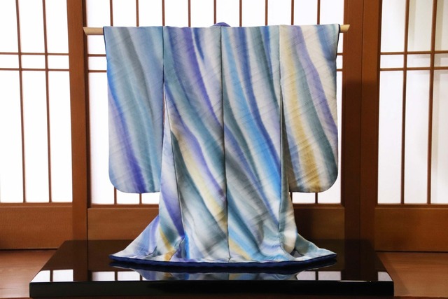 こちらは、縁起物の飾りとなります。 お嬢さまが、すくすくご成長され、ご成人され、良き嫁ぎ先にお嫁入りされるようにお作りさせて頂きました。 色目のオーダーも同額にてお受付いたします。お写真より、ご参考にされてください。 ご結婚後は、袖を短く仕立て直しお持ちくださるのも良し、そのままにして、次の世代に譲られるのも良しです。 【着物の種類】 引き振袖です。ふきと呼ばれる裾の所にも綿入れをし、本物そのもののお仕立てをしてあります。実際のものは、結婚式で花嫁が着られます。 見上げた空に晴天が広がっていくような、晴れやかな風を染めております。 【サイズ】 きもの本体、高さ約40センチ、横約36センチです。ただし、飾るのは、一回り低く、少し横長の衣桁に飾らなくてはなりませんので、実際の飾った寸法は、高さ35㎝・横40センチとなります。 【材質】 着物用最高級正絹 【お仕立て】 着物職人による、手縫い仕立て。 ::::::::::::::::::::::::::::::::::: 良い風が吹きますように。その想いをもって、kazeiroは、作品を染めています。 染める技法は、着物を染める技法で「風彩染」と言います。 独特の染め方は、京都でもこの工房でしか染められ無いぼかし染めです。それを、ミシン縫い・海外縫製ではなく、着物を縫う中でも最高級の、手縫い国内仕立てにて、仕上げていきます。 色柄お好みに合えば、ご安心してご購入いただけます。(15枚目のお写真は、レクサス宇治様に、2020年現在展示されている着物になります。) また、オーダーも受け付けておりますので、どうぞお気軽にお問い合わせください。 お値段は、オーダー内容にもよりますので一概には申せませんが、+5,000円~からお受付できます。 【ご自身のお着物でミニ着物を創りたい】 ご相談ください。図案構成費用・衣桁を含め、38,000円(税別)で出来上がります。 【無料プレゼント】 サイズに合う衣桁をご利用の方は、写真で使用している物をプレゼント致します。 【返品について】 万一色目が違うなどあれば、到着から3日以内未使用であれば返品可能とさせて頂きます。