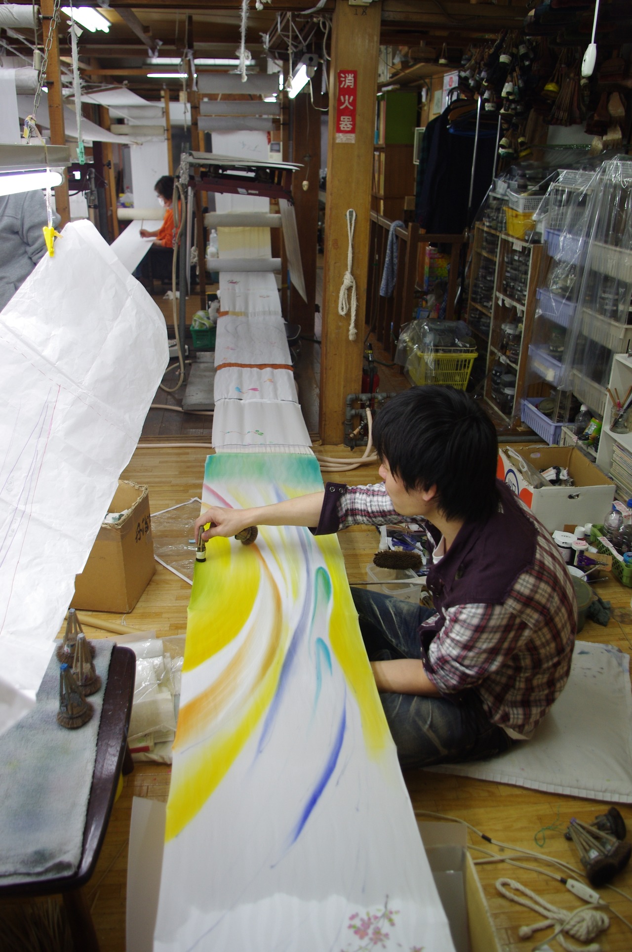 濡らしながら染める、「風彩染」の技法です。同じ風は吹かないように、同じものは決してできません。