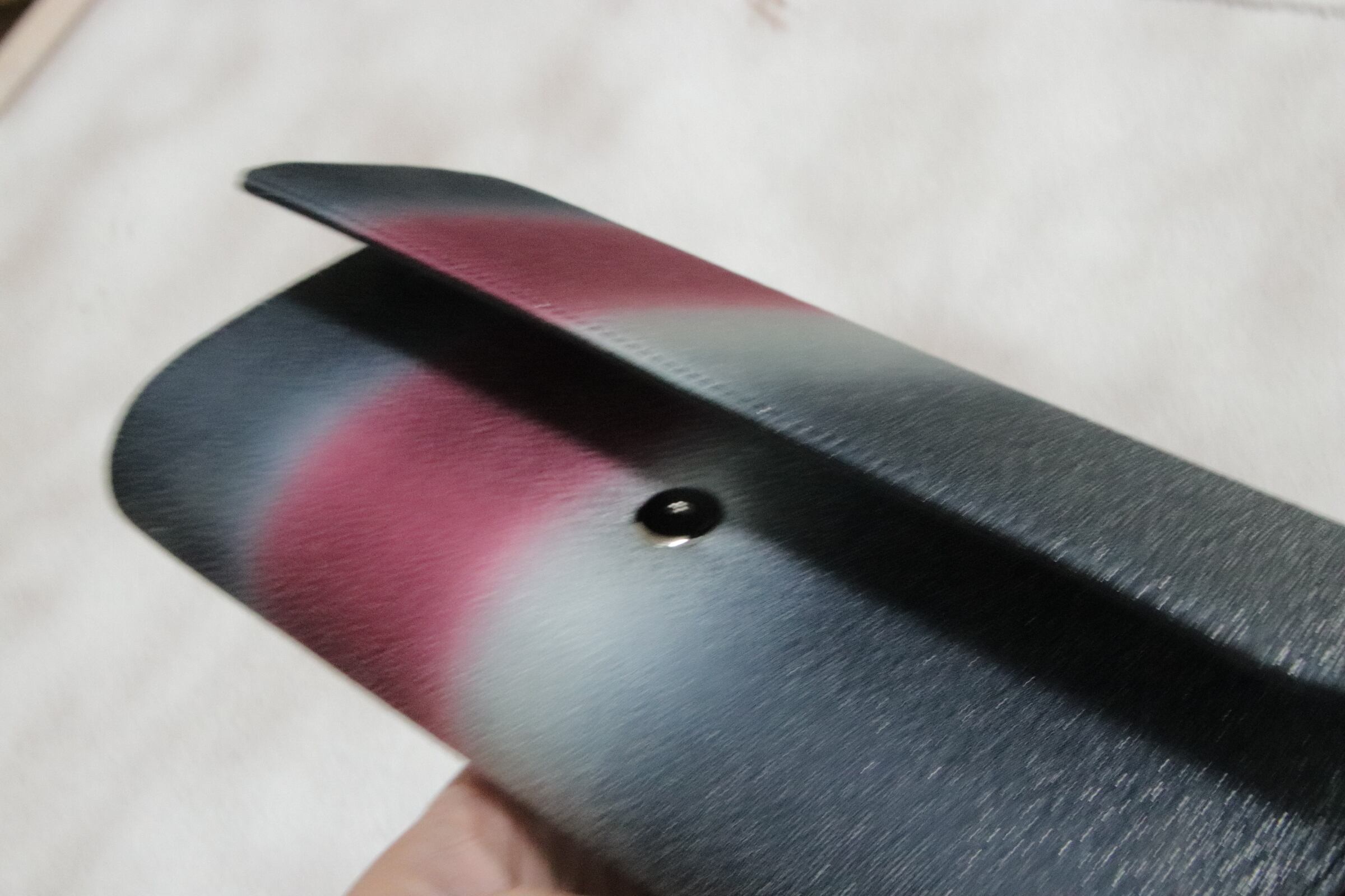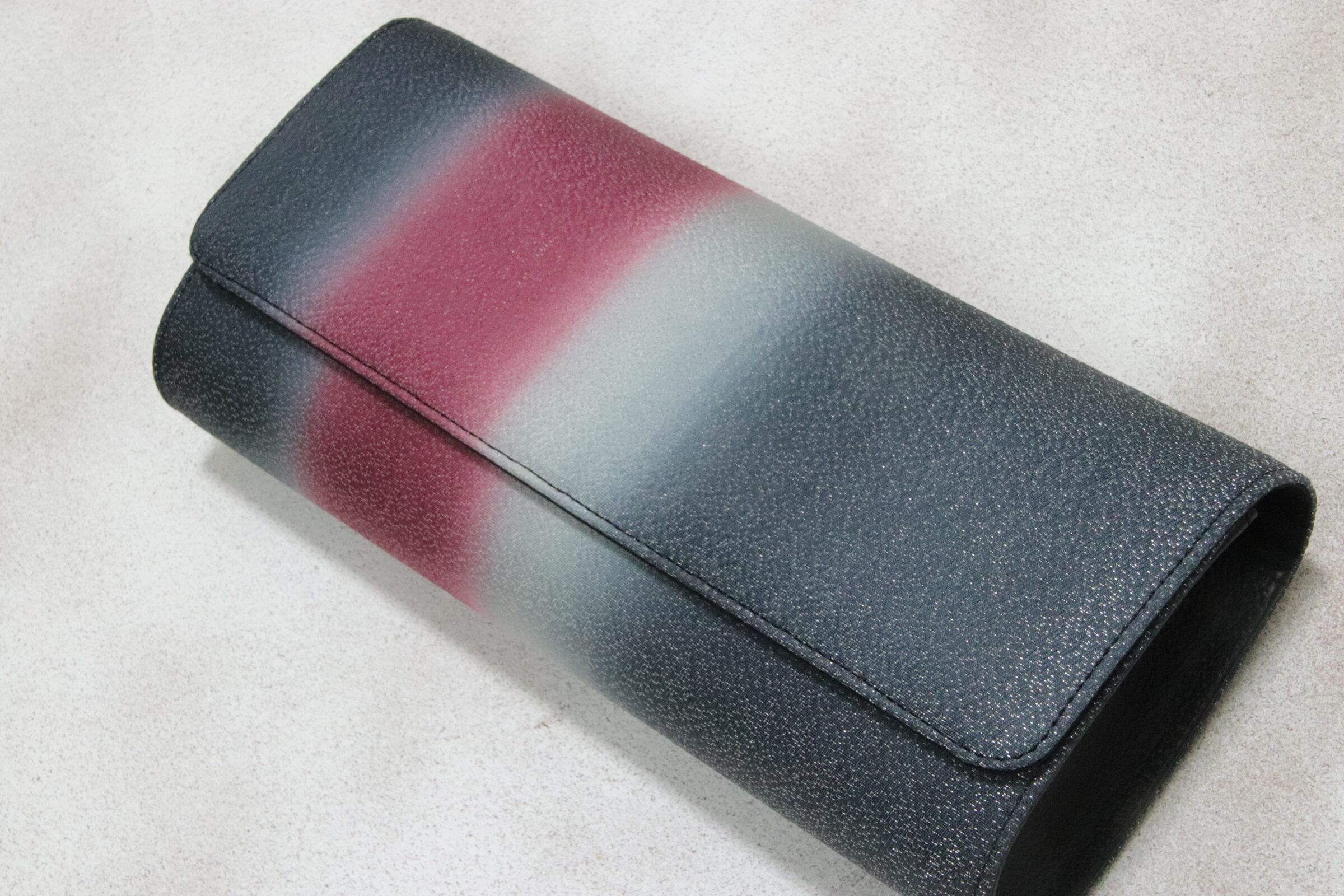 異彩を放つ、赤と黒のクラッチバッグ。引き染めと呼ばれる刷毛での染色は、4度染めてこの風合いを出しました。クールなスタイルを引き立てる、重厚感溢れる色合いです。