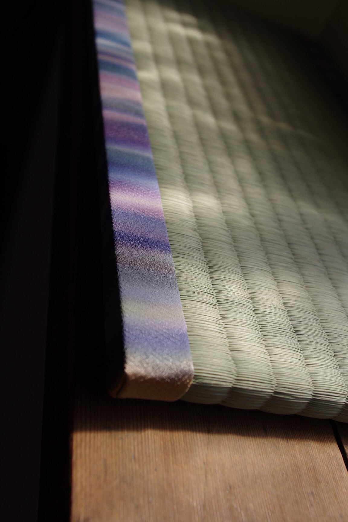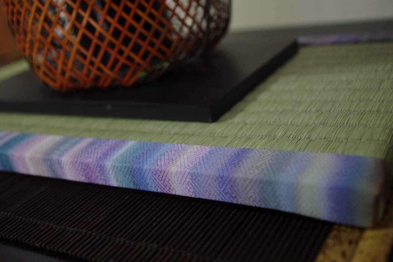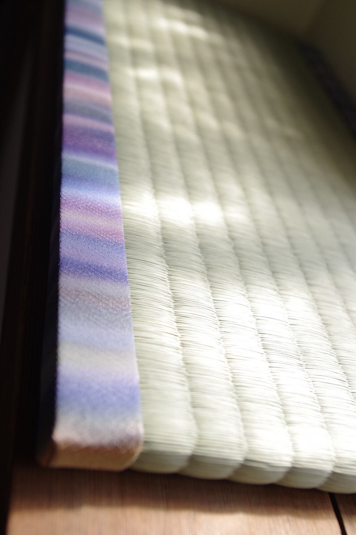 技法/畳の縁の部分を風彩染という技法で染め上げました。畳は廉価の和紙ではなく、い草製で、11代続く畳職人が仕立てております。