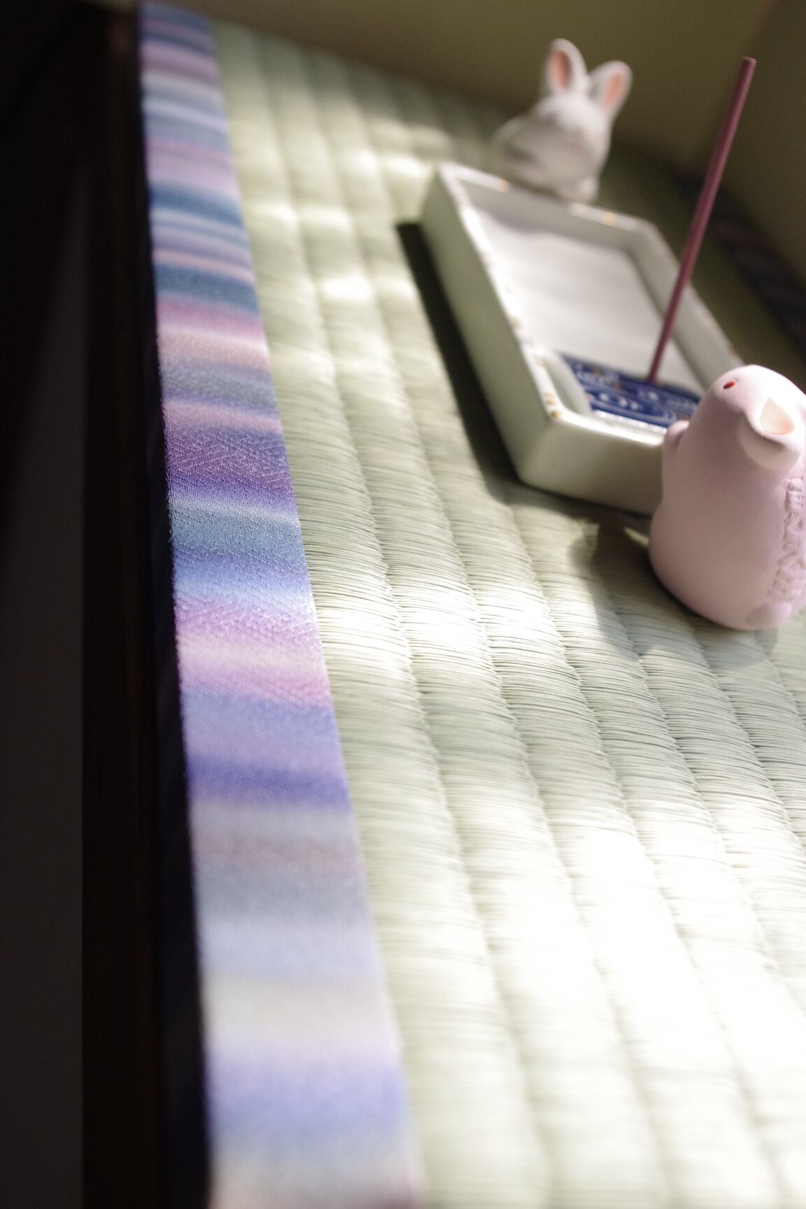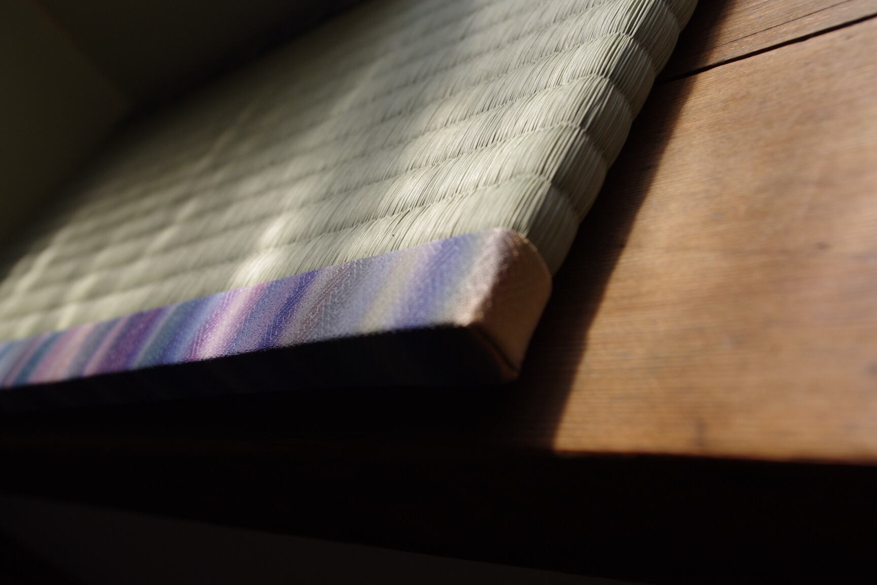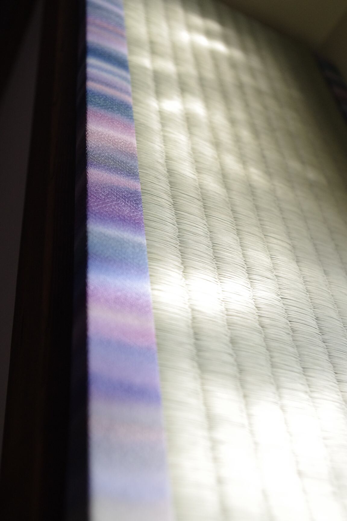 技法/畳の縁の部分を風彩染という技法で染め上げました。畳は廉価の和紙ではなく、い草製で、11代続く畳職人が仕立てております。