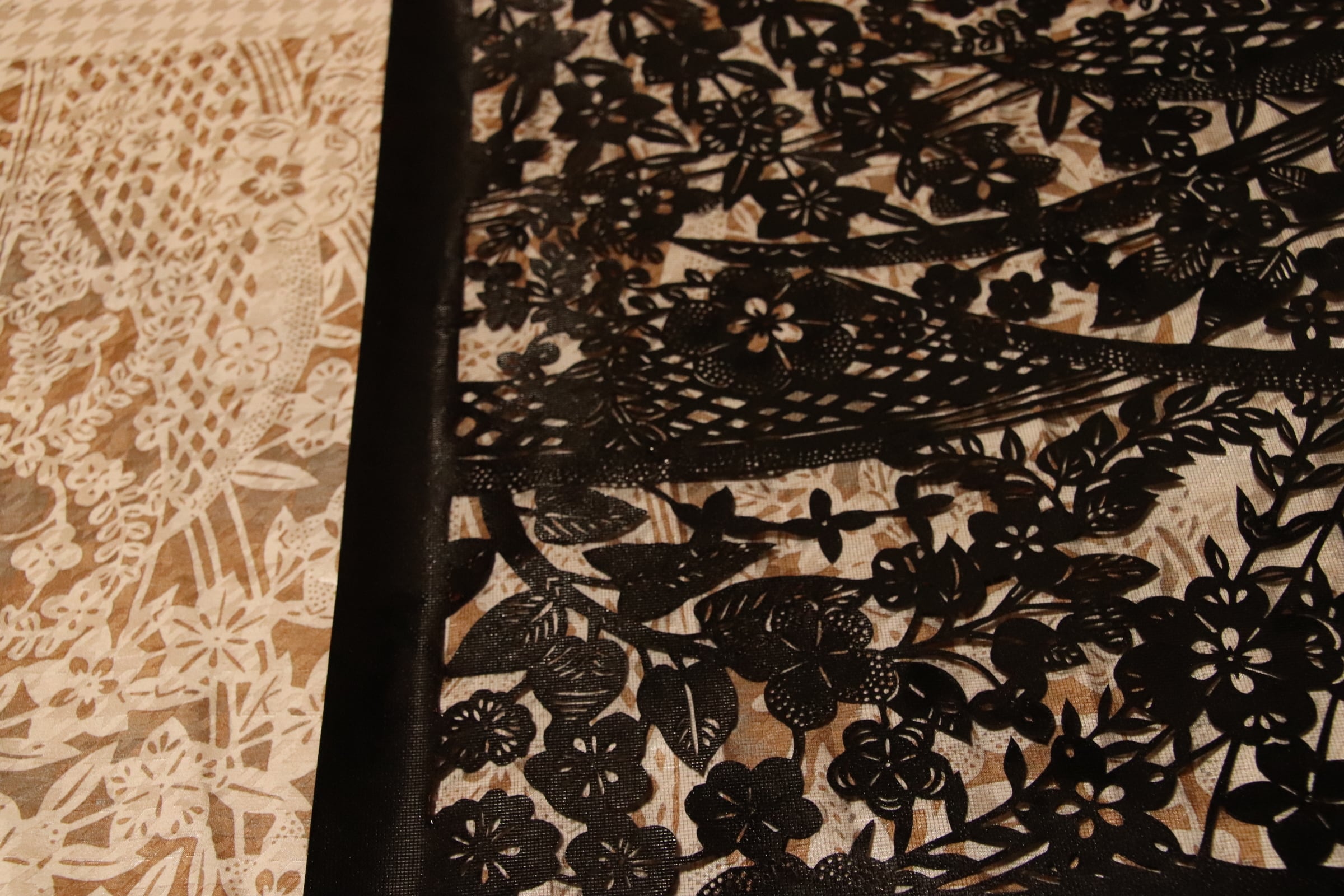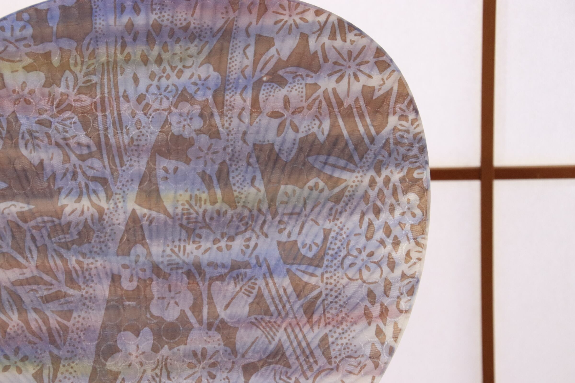 日本画の上絵を載せたり、木版や印刷、染めなどで色を載せたり、あるいは友禅の型紙や伊勢型紙の技法で透かしで草花や風景を表現します。