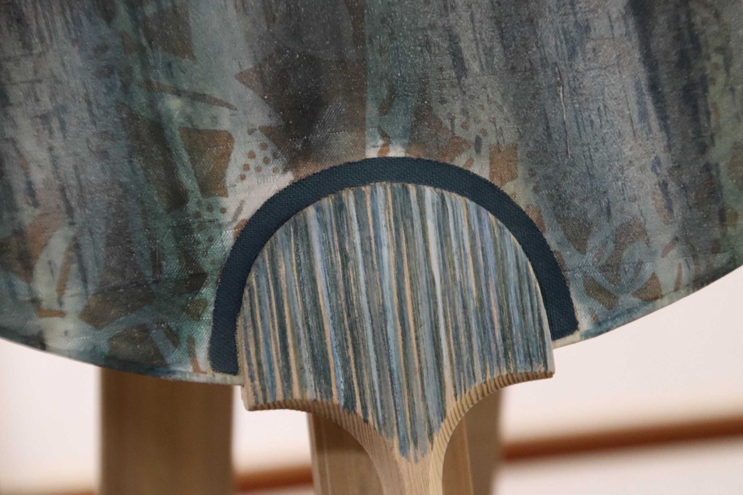 団扇面と把手が別に作られ、細い骨を一本づつ放射状にならべて、あとから柄をつけた構造。