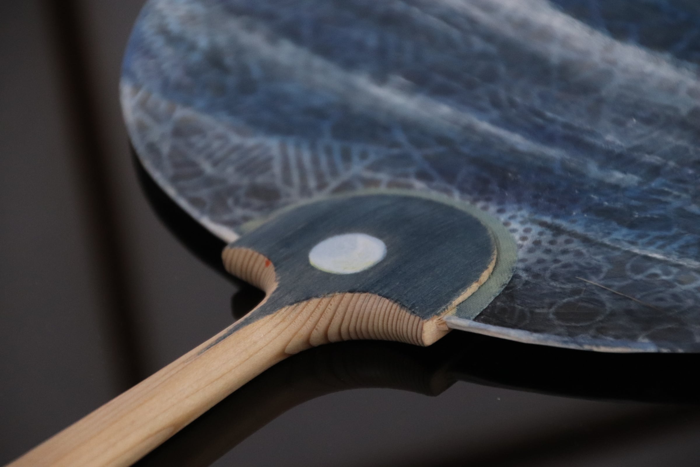 団扇面と把手が別に作られ、細い骨を一本づつ放射状にならべて、あとから柄をつけた構造。