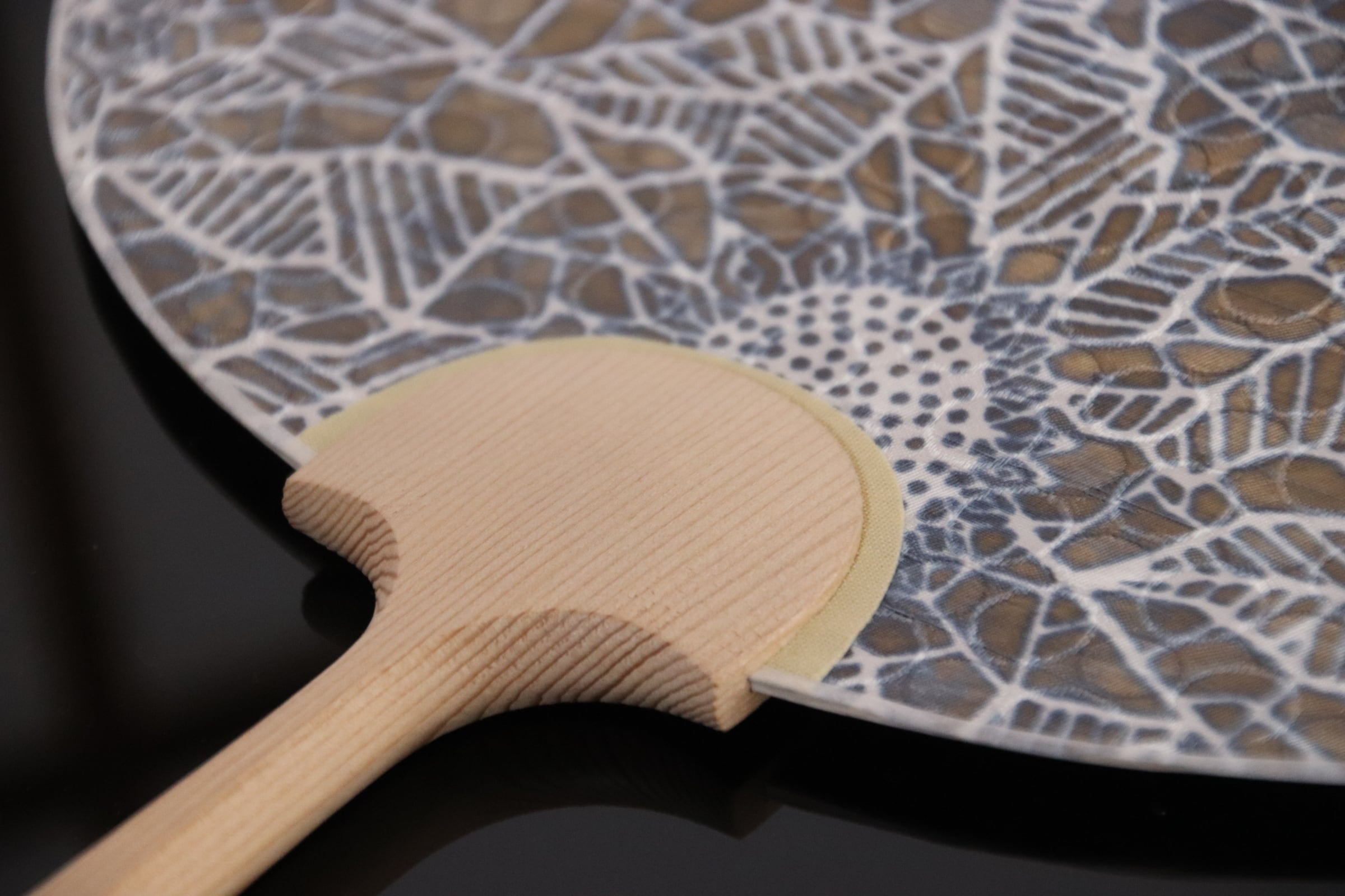 団扇面と把手が別に作られ、細い骨を一本づつ放射状にならべて、あとから柄をつけた構造。