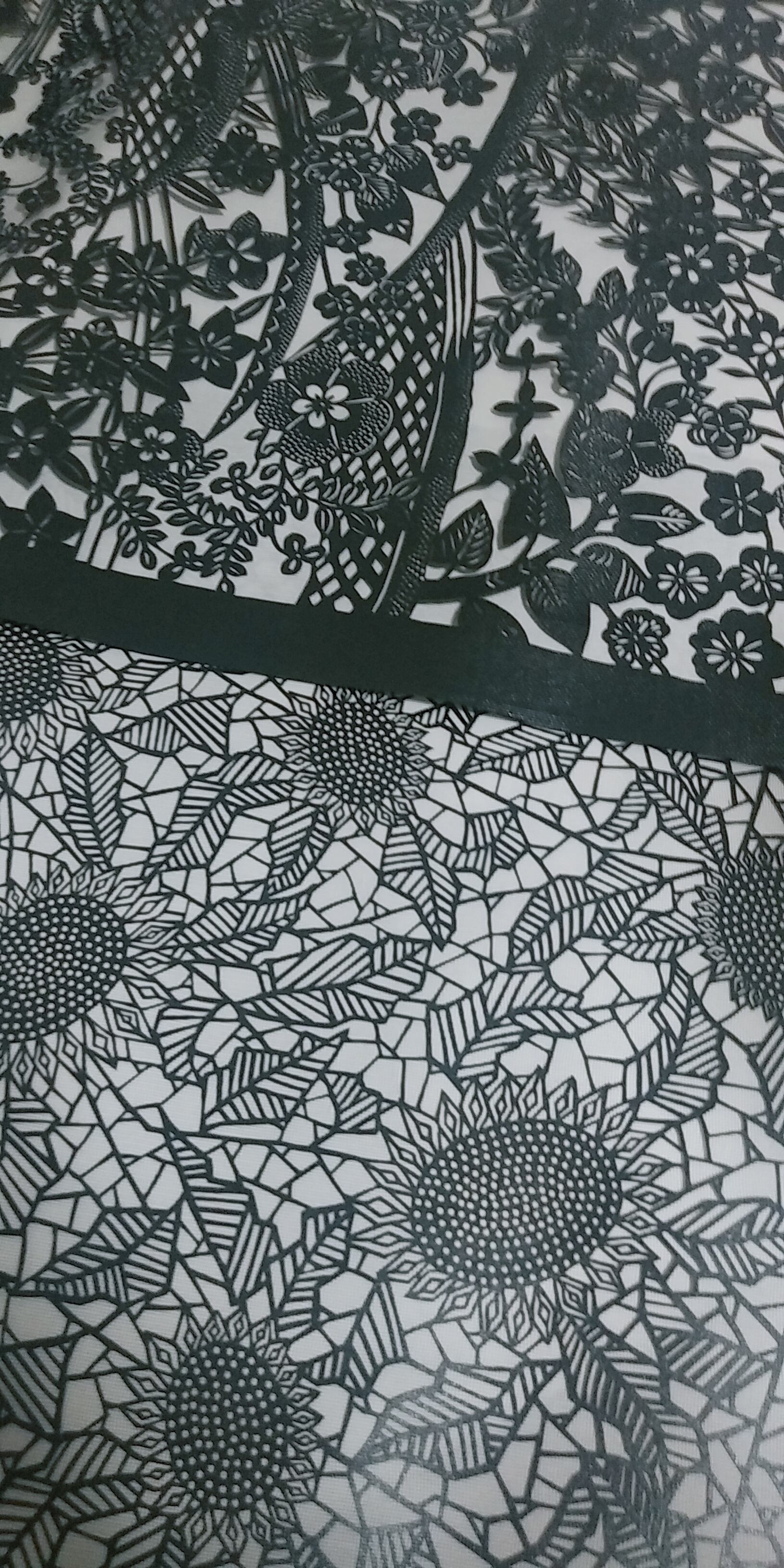 向日葵の柄は本場の伊勢型紙(型紙と言えばここです。)を用いて、糊染料にて手染めしました。