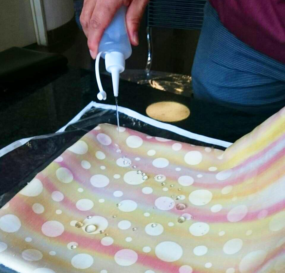 この研究の中で、全てをクリアする技術を開発したんです。1年かかって、いろんな仕事を犠牲にして、研究しました。(着物作家で日傘を手描きで染められるのは、おそらく私だけかと思います。)