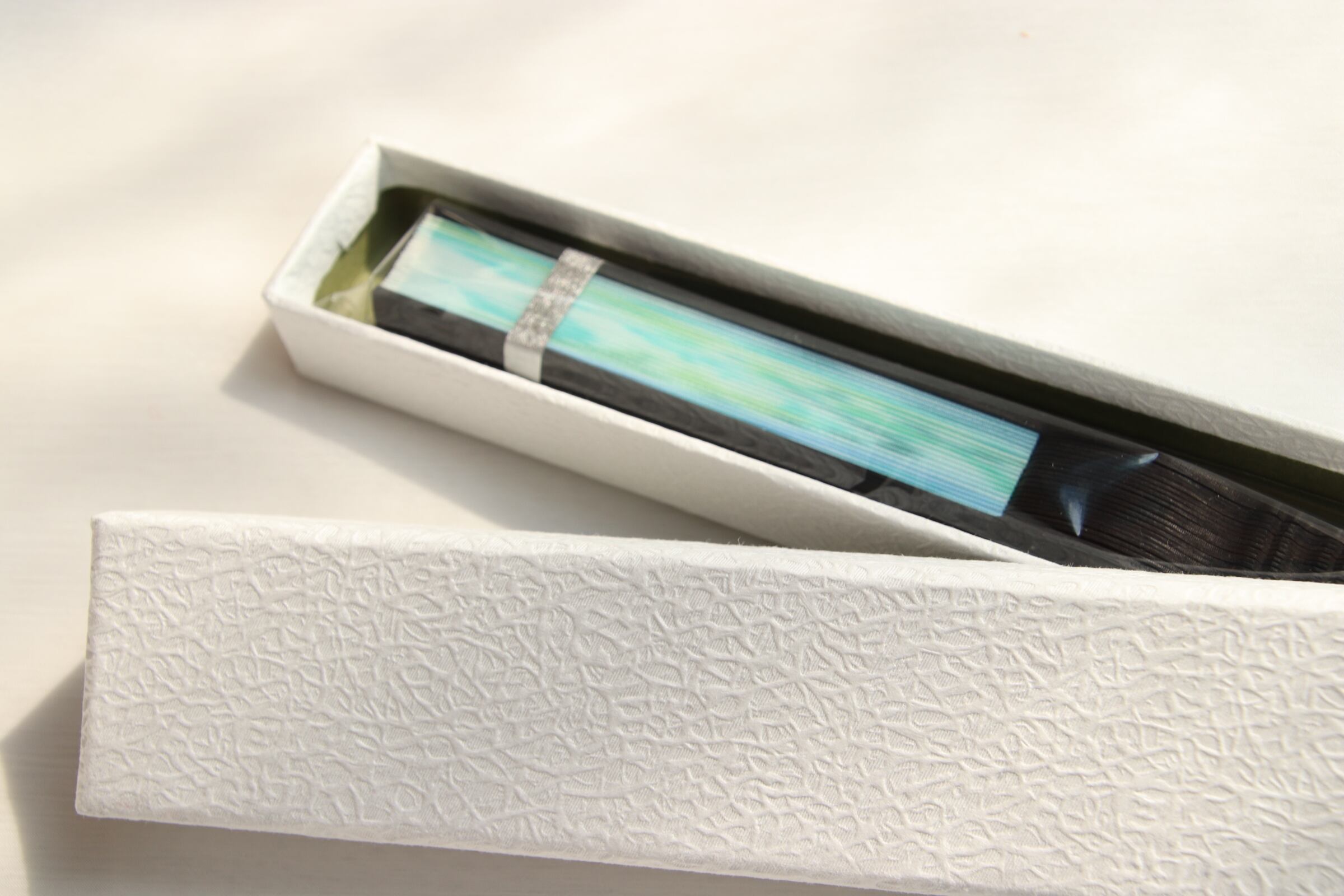 写真にある手染めの扇子袋と、オリジナル桐箱のご用意がございます。