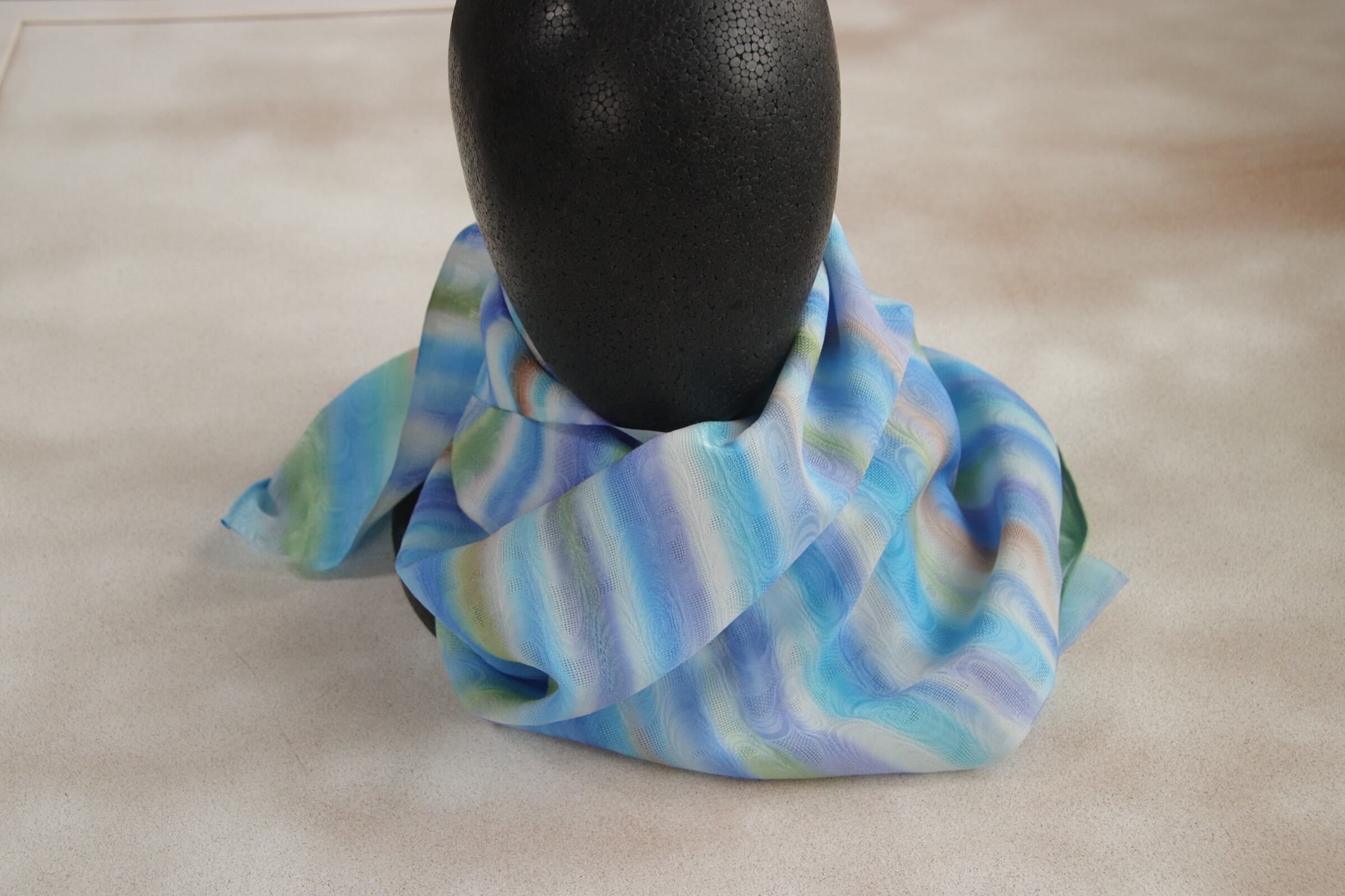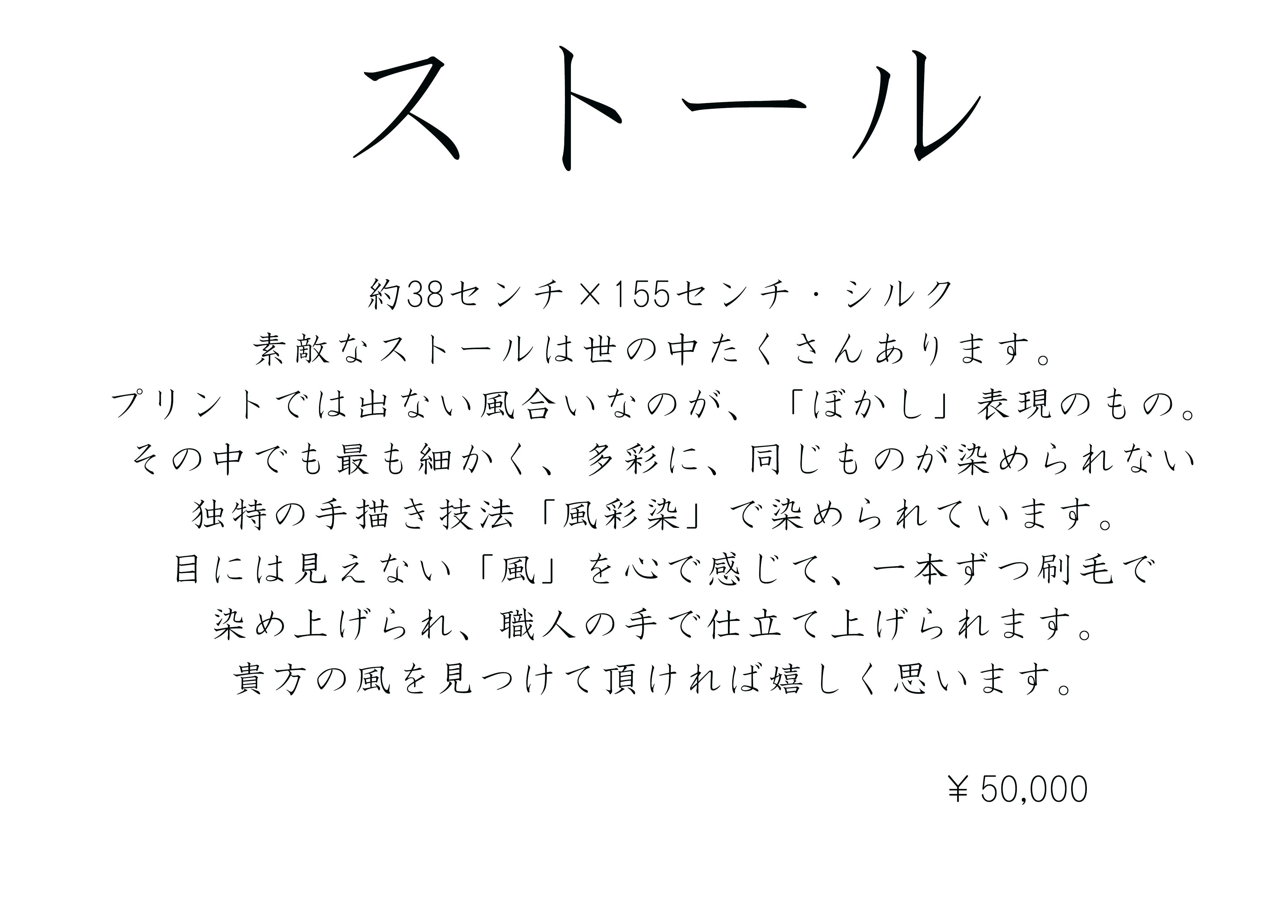 このストールは、個人的に青が好きなので、一番つけたい色目です。青が好きな私が、目一杯好きな青を染めました。青大好きな方の元へ届きますように。
