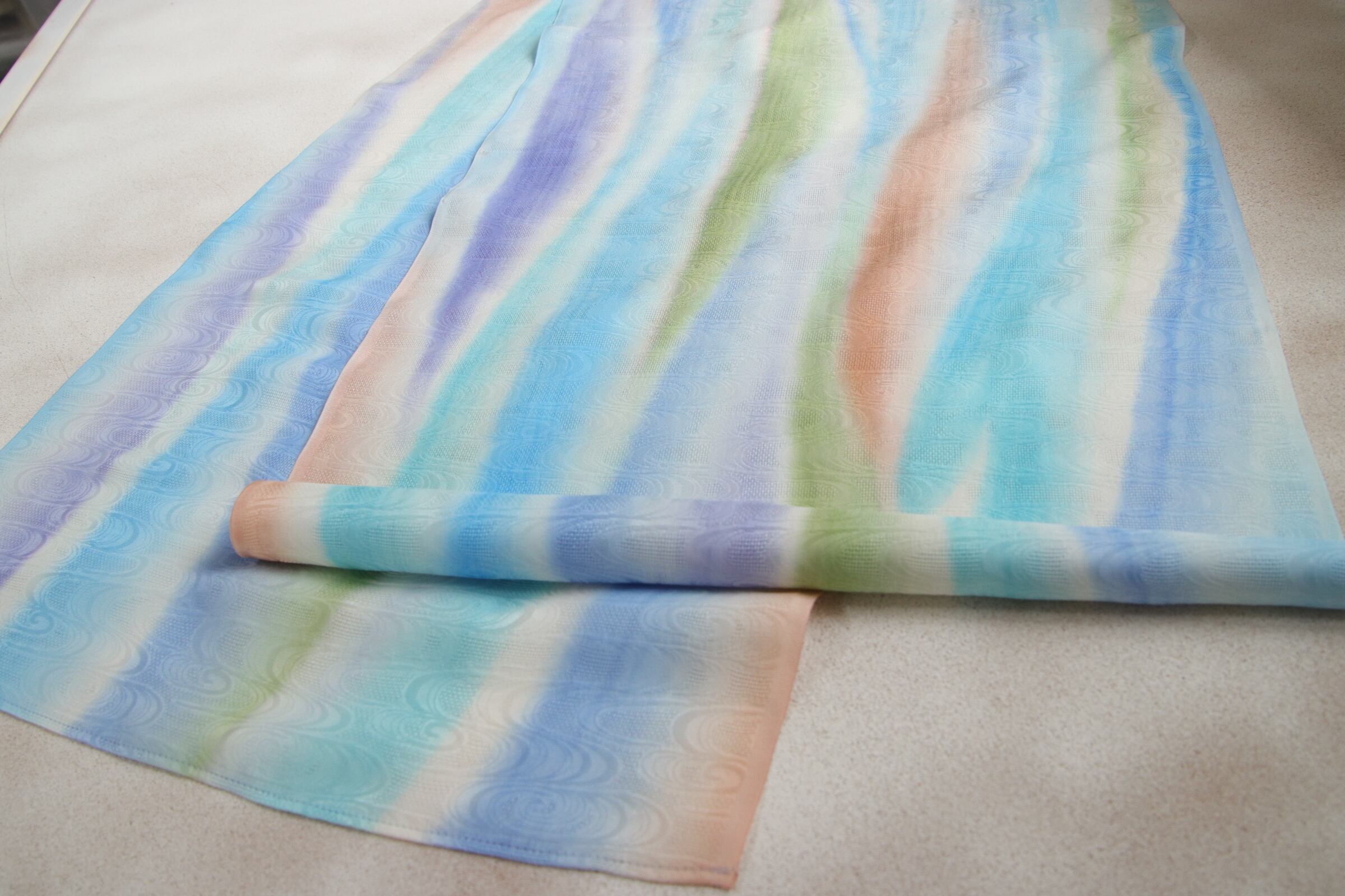 お手入れ:手拭いや薄手のハンカチで当て布して、蒸気アイロンかけて頂けます。洗うのは、業者にお出しください。
