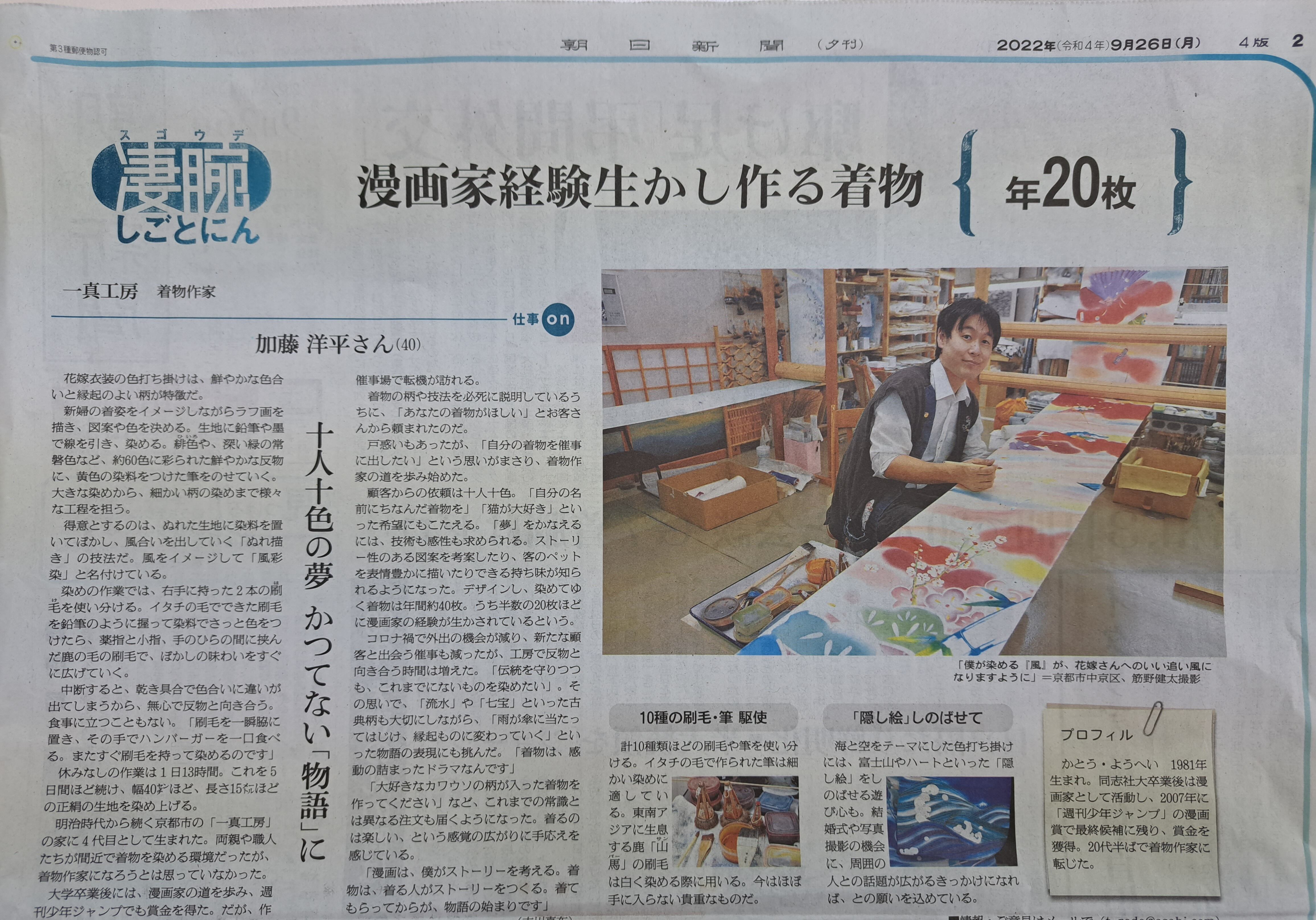 こちらサイト内の映像は、NHK WORLD JAPAN 「core京都」より、世界13か国と国内全国で放映された番組となります。京都の染めの代表として出演したものになりますので、ご参考までにご覧くださいませ。(21分30秒より登場します)